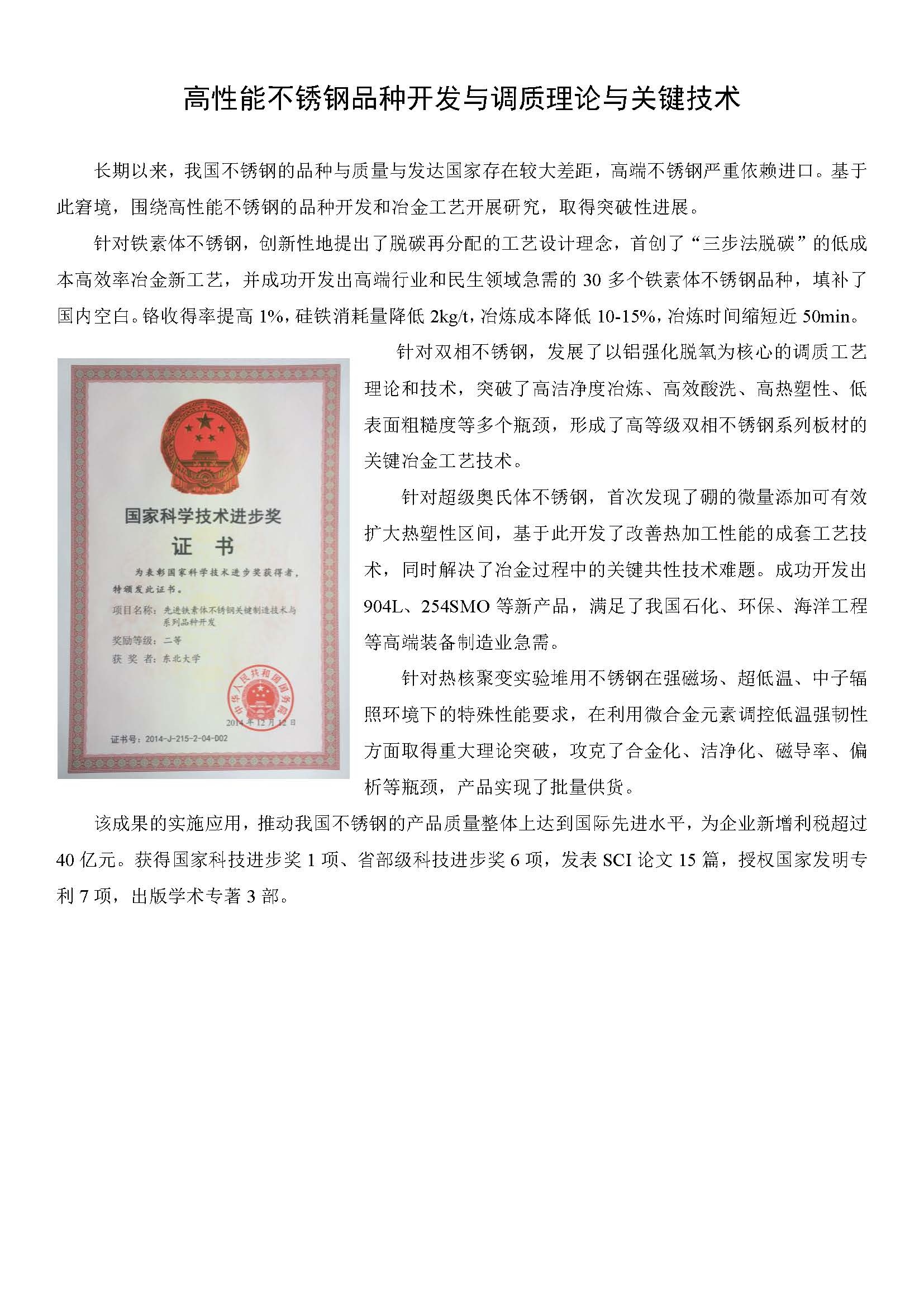 高性能不锈钢品种开发与调质理论与关键技术
