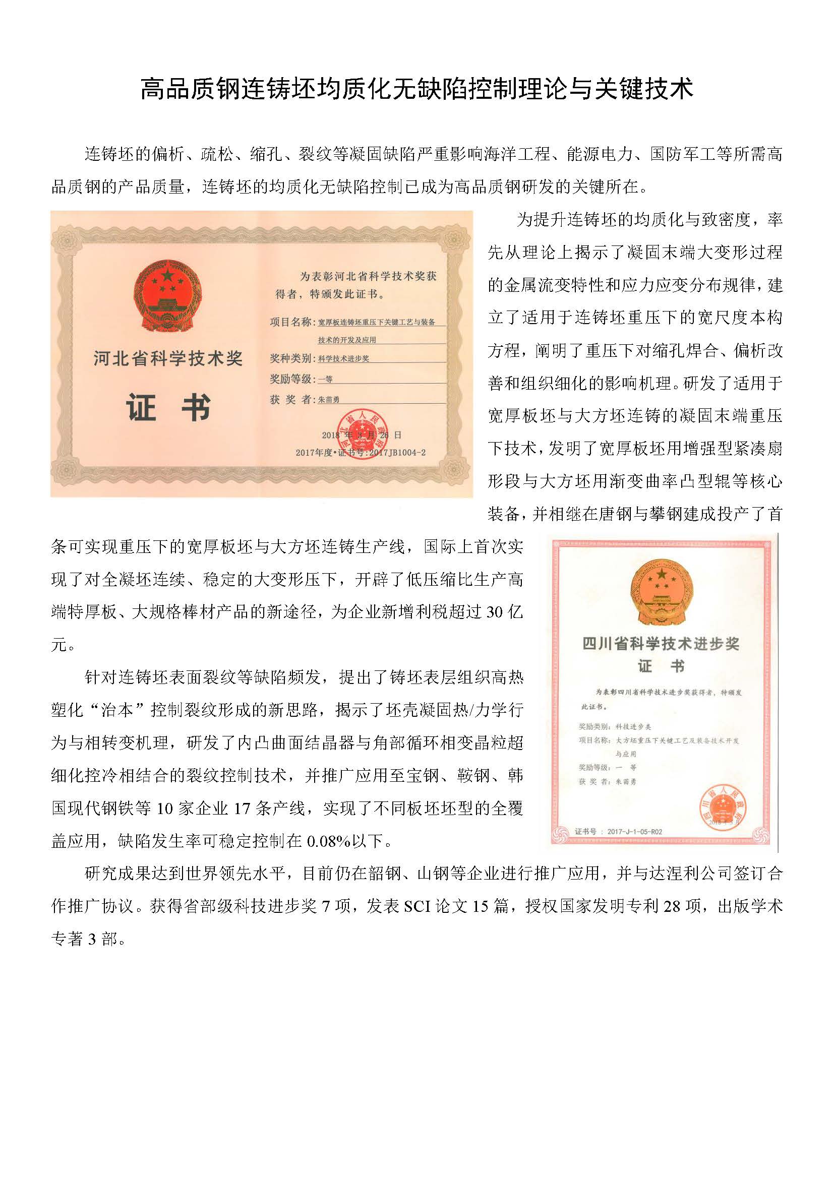 高品质钢连铸坯均质化无缺陷控制理论与关键技术
