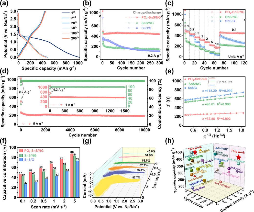 钠离子电池因钠资源分布广泛、成本低廉和储量丰富等优势,成为极具潜力的下一代储能设备。硫化锡(SnS)具有独特的二维层状结构及较高理论比容量等特点,被认为是理想的储钠负极材料之一。然而,SnS较低的电子电导率、缓慢的电化学反应动力学以及充放电过程中严重的体积膨胀和团聚导致其循环稳定性和倍率性能不理想。东北大学冶金学院李犁教授团队针对以上问题,采用具有螯合作用的植酸,成功将PO43−以Sn-O-P形式引入SnS层间;PO43−作为多向导电柱抑制了SnS的结构塌陷,同时提高了金属硫化物的本征电导率。DFT理论计算表明PO4-SnS的构建使费米能级附近电子分布得到显著增强。差分电荷密度分布显示PO43−的引入导致SnS内电荷分布不均匀、形成内建电场,从而加速了负极材料中Na+和电子的传输。基于以上原因,PO4-SnS/NG呈现出优异的可逆容量和超长循环寿命,在5 A g−1下10,000次循环后,每次容量衰减仅为0.0028%(图1)。本工作为设计和制备高性能钠离子电池负极材料提供了一种新的思路和可行的解决方案。