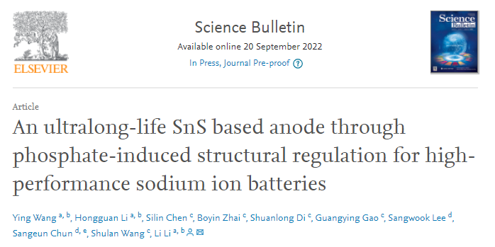 近日,多金属共生矿生态化冶金教育部重点实验室李犁教授团队在钠离子电池领域取得重要研究进展,相关研究成果以“An ultralong-life SnS based anode through phosphate-induced structural regulation for high-performance sodium ion batteries”为题,在中国科技期刊卓越行动计划领军期刊Science Bulletin发表。该成果以东北大学冶金学院为第一完成单位,冶金学院博士研究生王颖为论文第一作者,李犁教授为论文唯一通讯作者。我校分析测试中心为本工作材料结构表征及其他数据采集提供重要支撑。Science Bulletin(科学通报)创刊于1950年,为中国科学院、国家自然科学基金委员会、Elsevier联合出版的自然科学综合性期刊,致力于快速发表自然科学与技术各领域的原创性研究成果,位列全球73种多学科综合类期刊第5位。