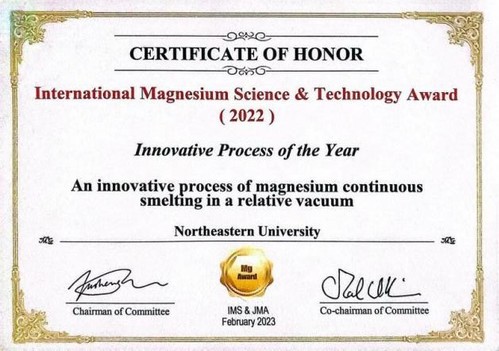 国际镁科学与技术奖由国际镁学会(International Mg Society)和镁合金学报(Journal of Magnesium and Alloys)于2020年设立,国家镁合金材料工程技术研究中心等单位协办,旨在促进镁及镁合金的发展和应用。中国工程院院士、国际镁学会主席潘复生教授担任评奖委员会主席,来自中国、美国、加拿大等23个国家的113位知名专家担任评委。2022年度奖包括年度创新特别贡献奖、优秀论文奖、创新工艺奖等8个奖项,共评选出26位获奖个人和单位,其中2022年度创新工艺奖颁发给了东北大学原镁相对真空连续热还原技术在内的3个创新工艺。国际镁科学与技术奖涵盖了镁冶炼、镁基结构材料和镁基功能材料等领域,将对今后几年的镁及镁合金发展产生重要影响。