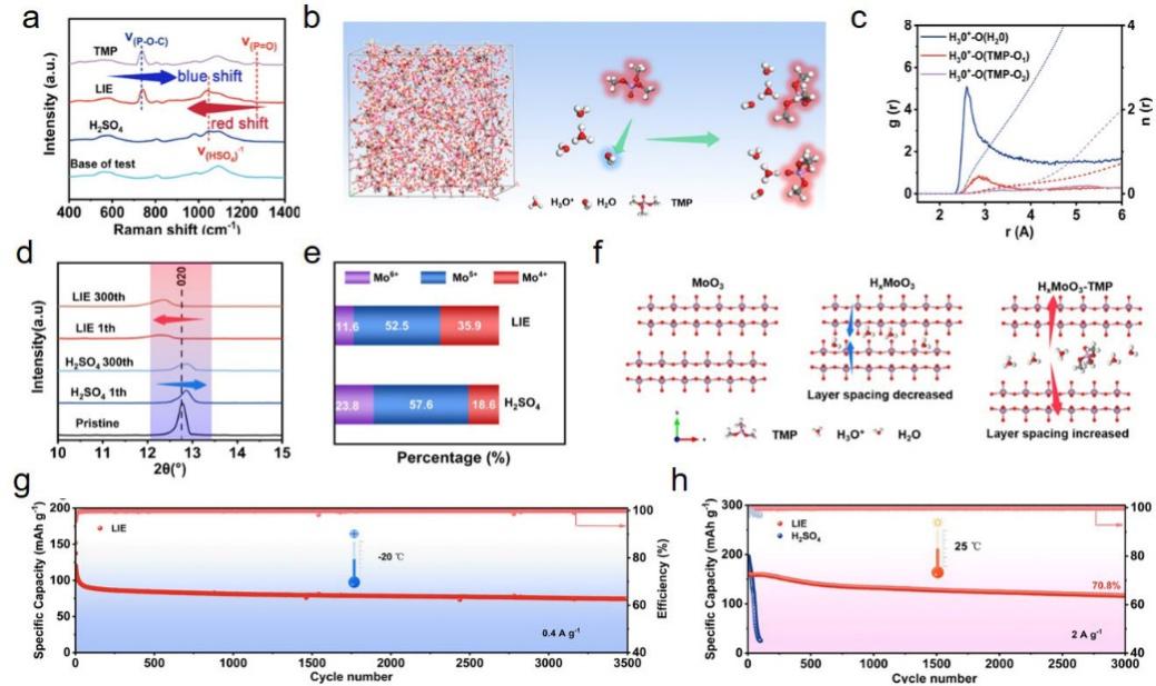 水性电池由于其不易燃、环保和低成本的优点而广受关注。其中,质子电池具有离子尺寸小、摩尔质量低、质子扩散速率快的特点,赋予电极材料高的离子电导率和快速的反应动力学。传统电解质中容易出现析氢反应等副反应,限制了电池的电位窗口,同时对电极会产生腐蚀,导致电极材料结构坍塌,严重影响电池的稳定性。设计能够实现电极材料长期循环的电解质是质子电池发展的一项挑战。基于典型的硫酸水溶液体系设计了一种混合电解液(LIE),引入了磷酸三甲酯(TMP)来构建复杂的氢键网络,以实现电解液中自由水的固定,减少对电极的腐蚀;同时TMP参与到H3O+的溶剂化壳层中,和H3O+之间的相互作用抑制了副反应的发生,大幅度提升了电池的稳定性。通过研究发现,LIE体系下三氧化钼负极在充放电过程中层间距发生了较大的变化,这一现象表明在充放电过程中TMP可以在三氧化钼负极中实现层间的插入和脱出,这有利于拓宽质子的传输通道;同时电极在放电态时更多的低价态产物表明产生了更多的电荷存储。在水系质子电池之外,TMP体系在其他水系离子电池中也表现出良好的性能提升效果。这项工作对水系离子电池电解液的设计提供了新的见解,并为实现稳定运行的水系电池提供了新的解决方案。东北大学分析测试中心为数据采集和表征工作提供了重要支撑。